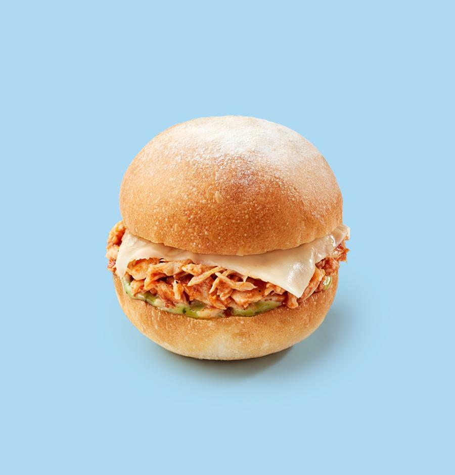 동그란 바게뜨 안에 잘게 조사진 닭가슴살이 들어있는 햄버거 모양 샌드위치.
