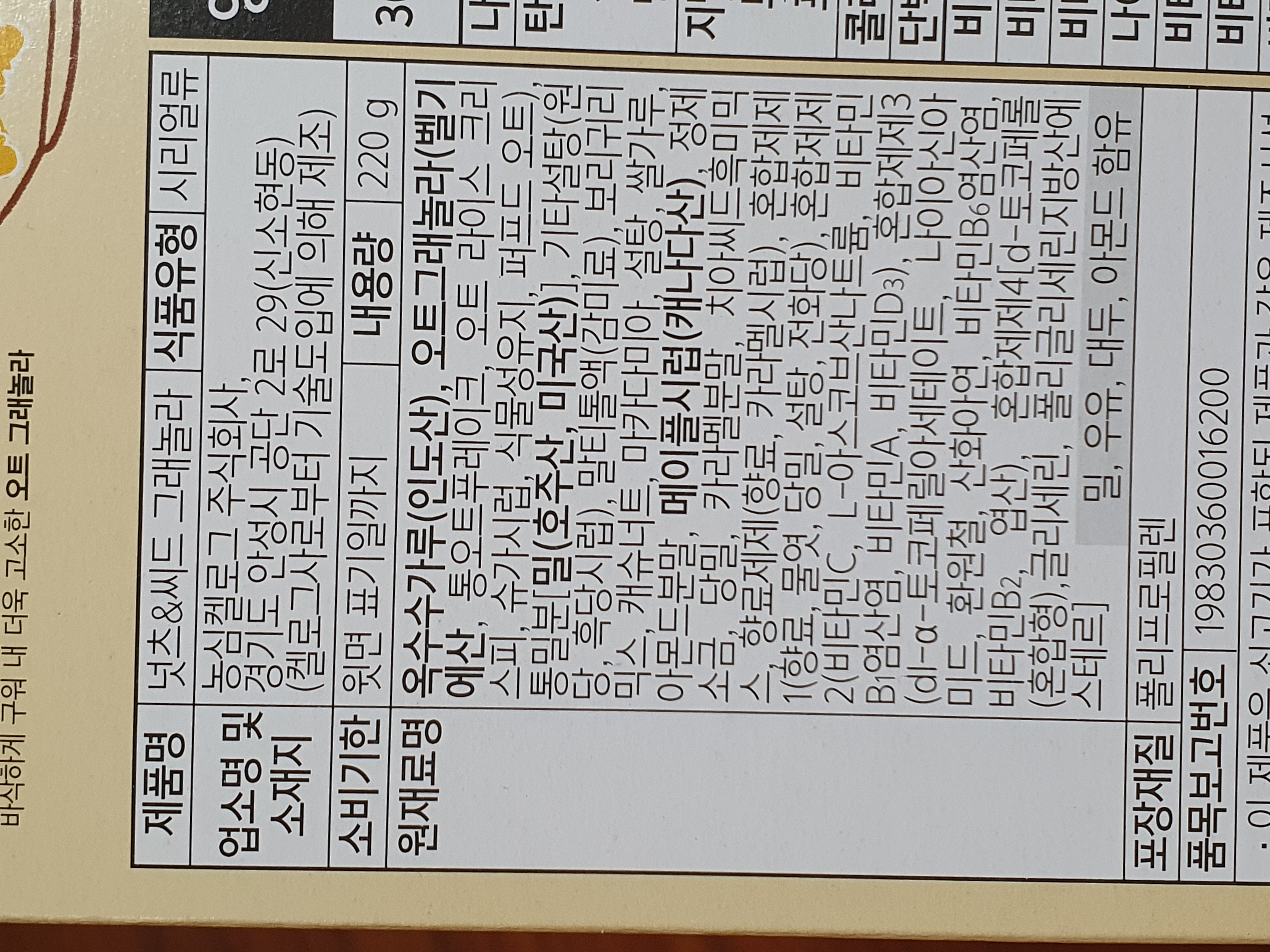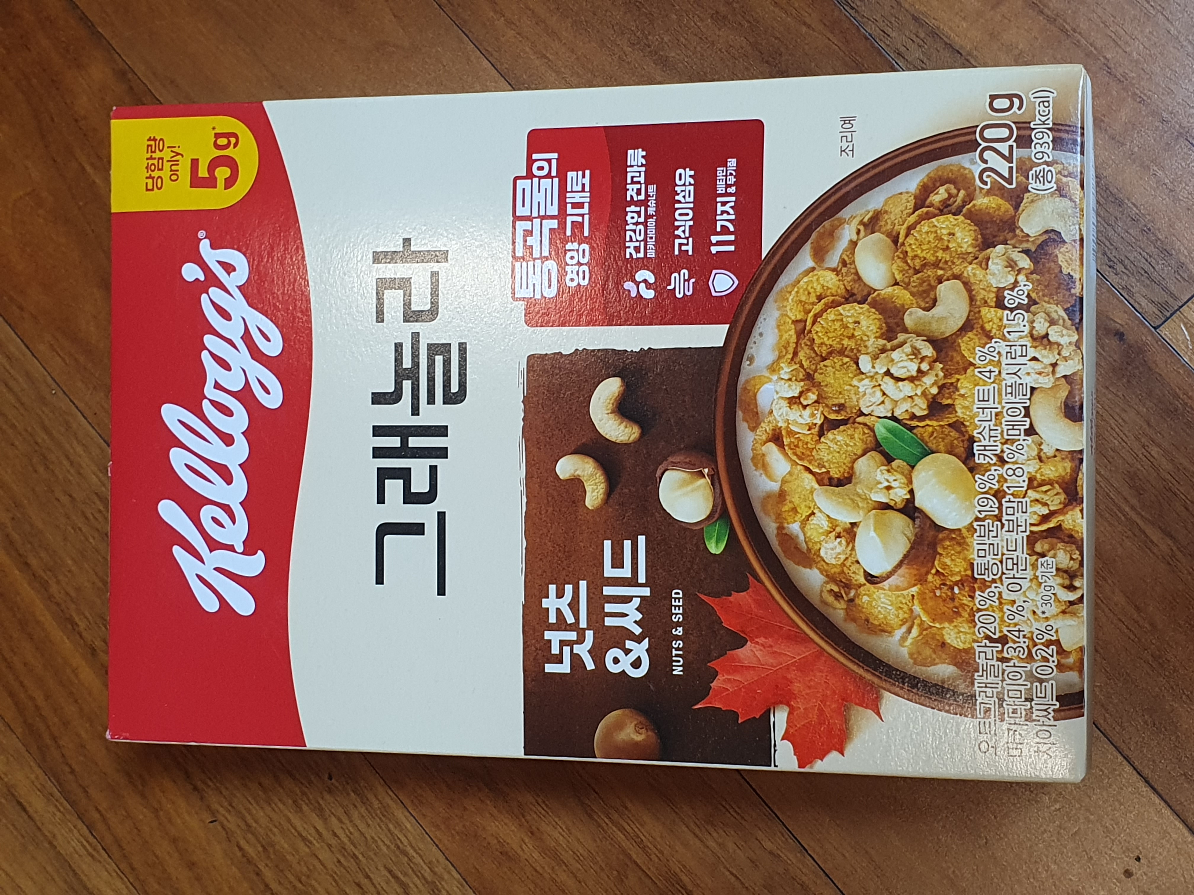 캐슈넛, 마카다미아 같은 견과가 들어있어 아몬드만 들어있는 씨리얼과 차별점이 있다. 근데 좀 비싸긴 해.