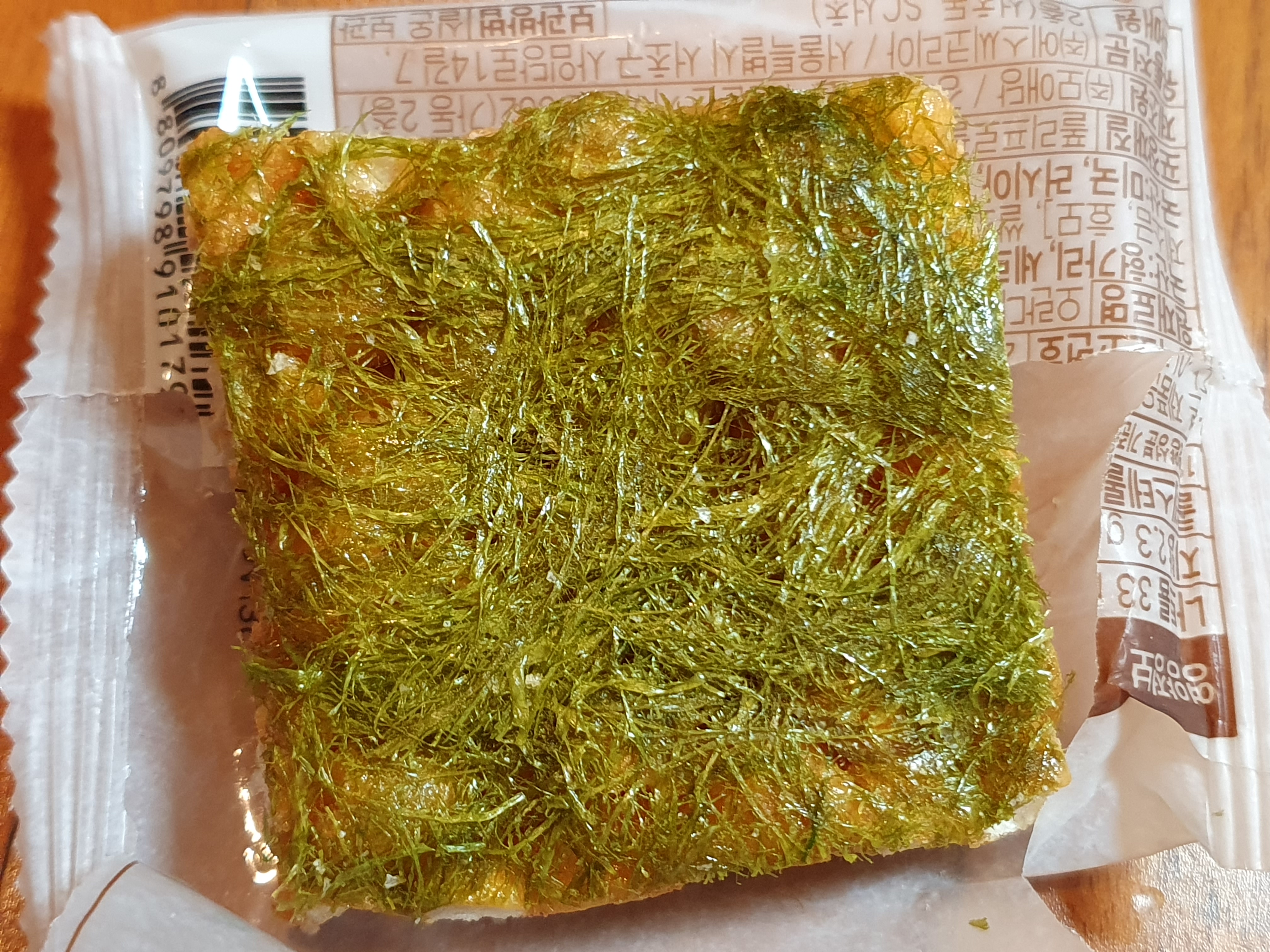 손가락 네 개 정도 크기에 한 면에 감태가 붙어있다.