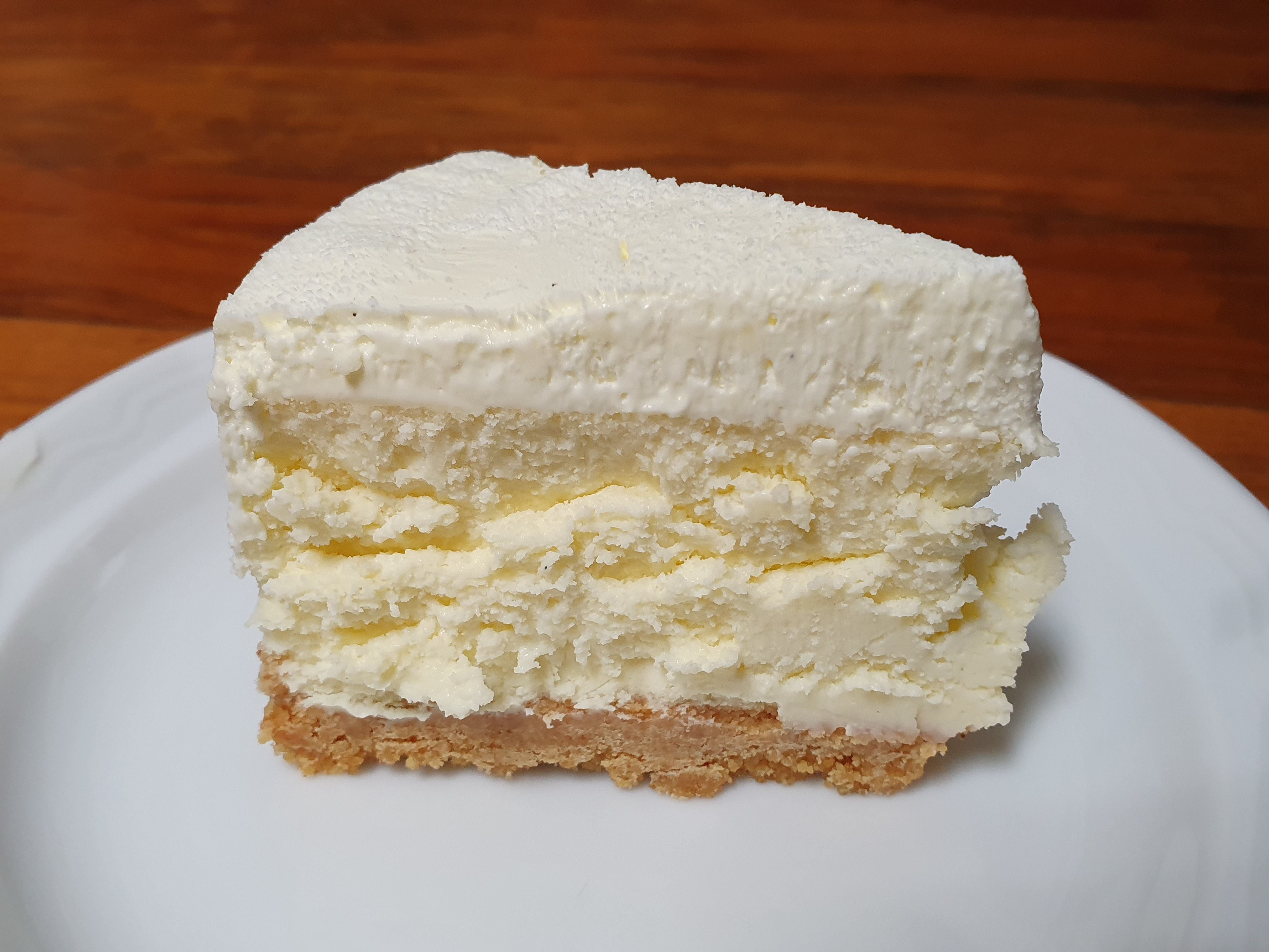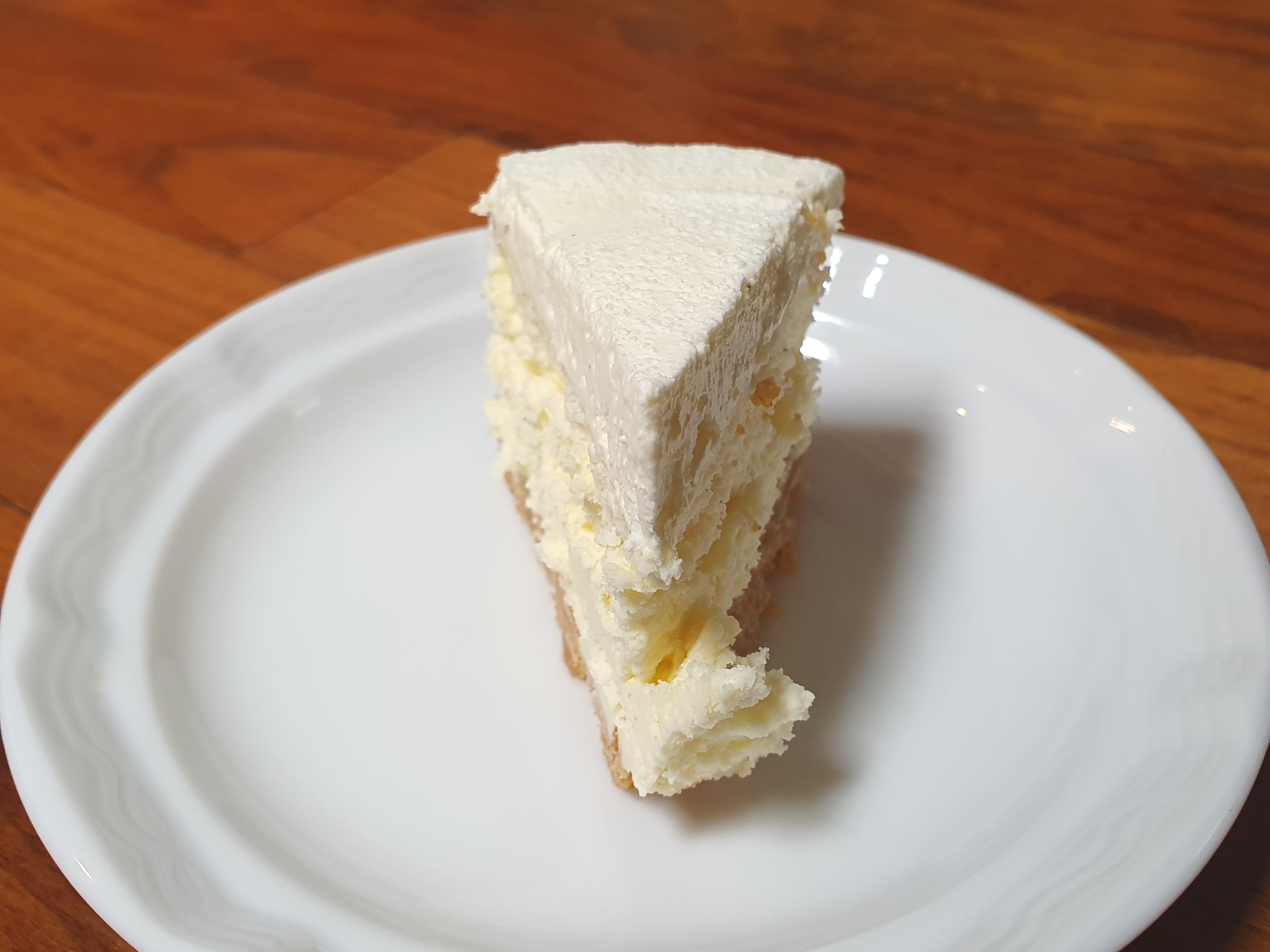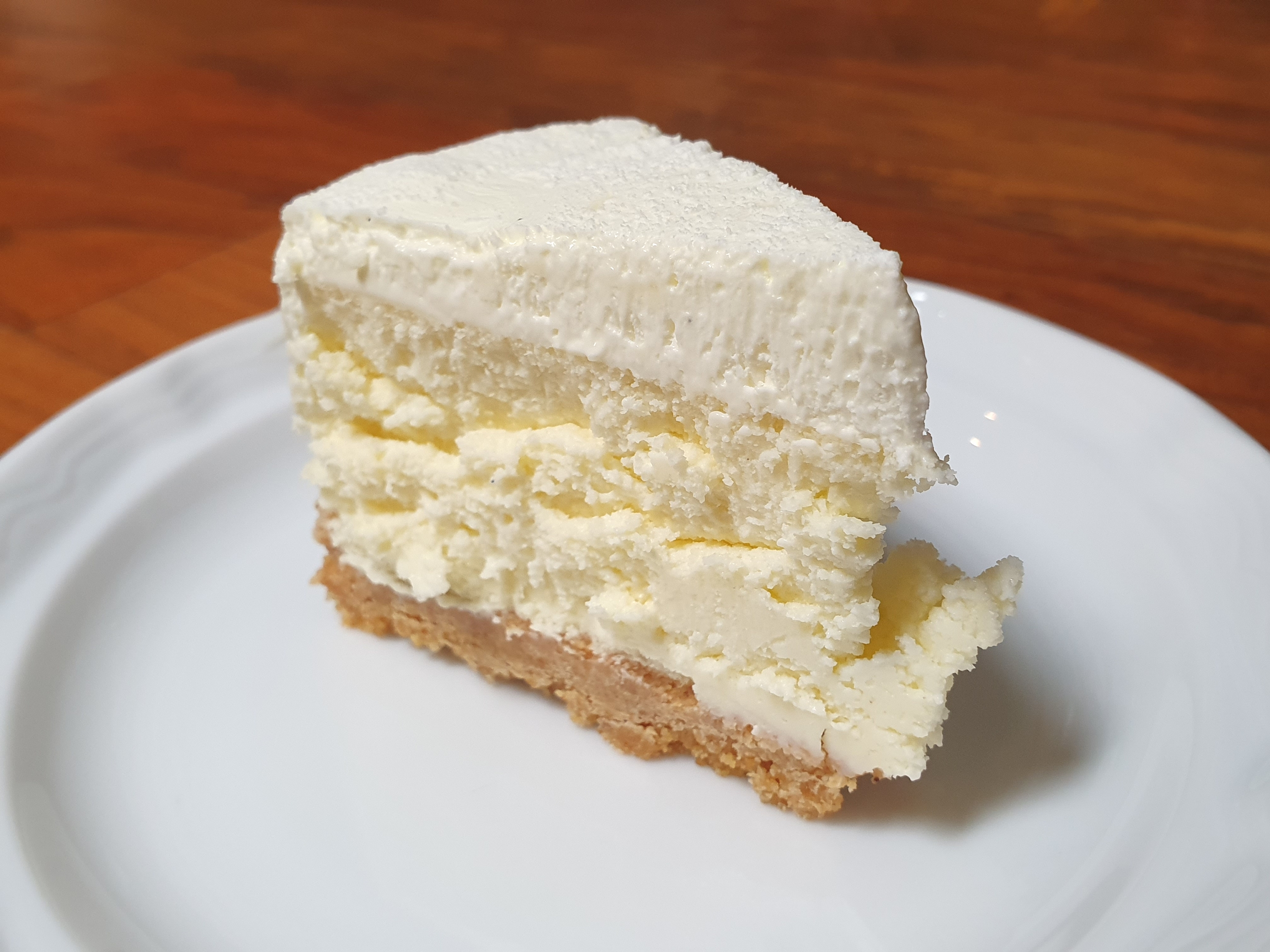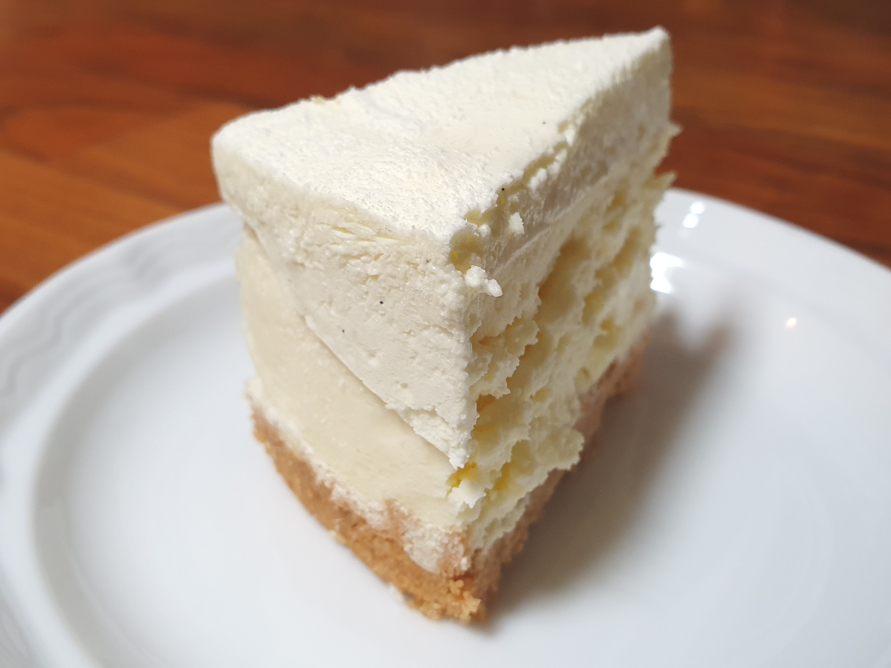 바닥은 다이제 쿠키 스타일 버터쿠키고 중간이 크림치즈, 위에 좀 더 밝은 흰색 부분은 생크림이다.