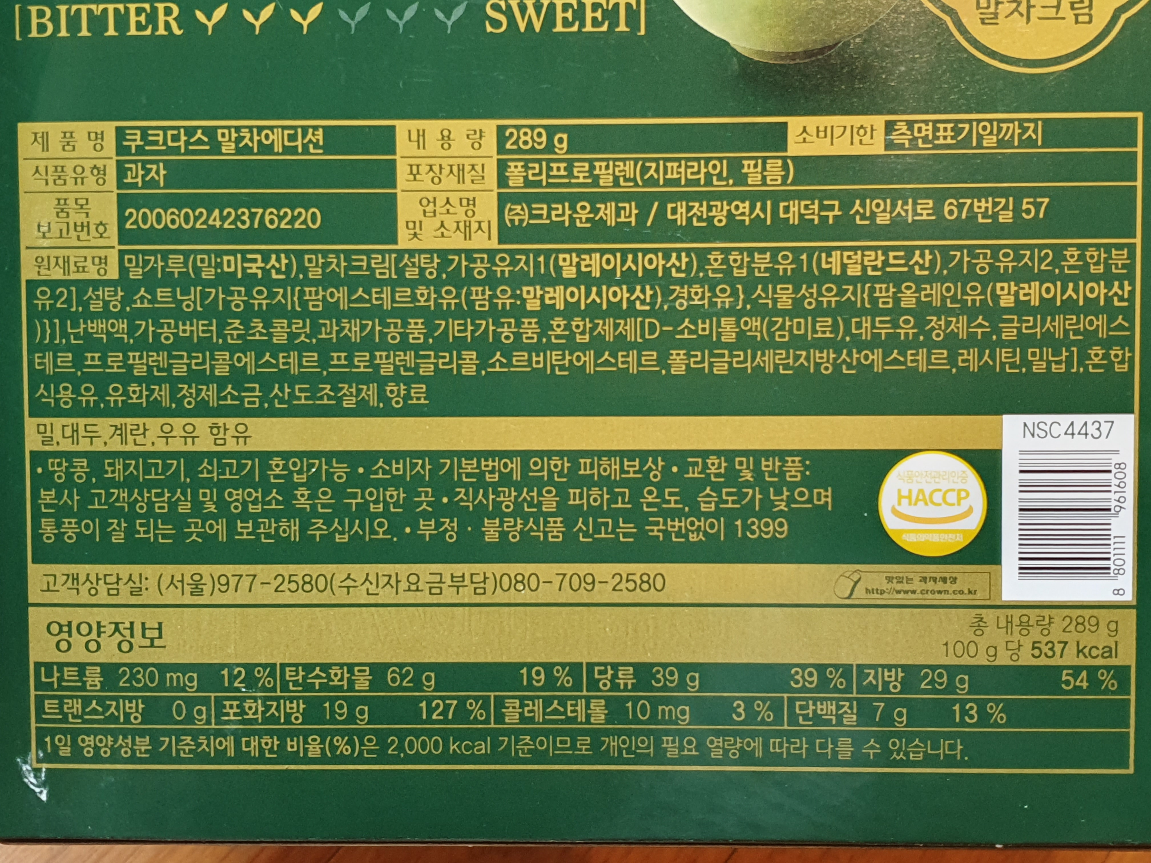 쿠크다스는 커피맛이 최고였는데 말차맛도 맛있다.