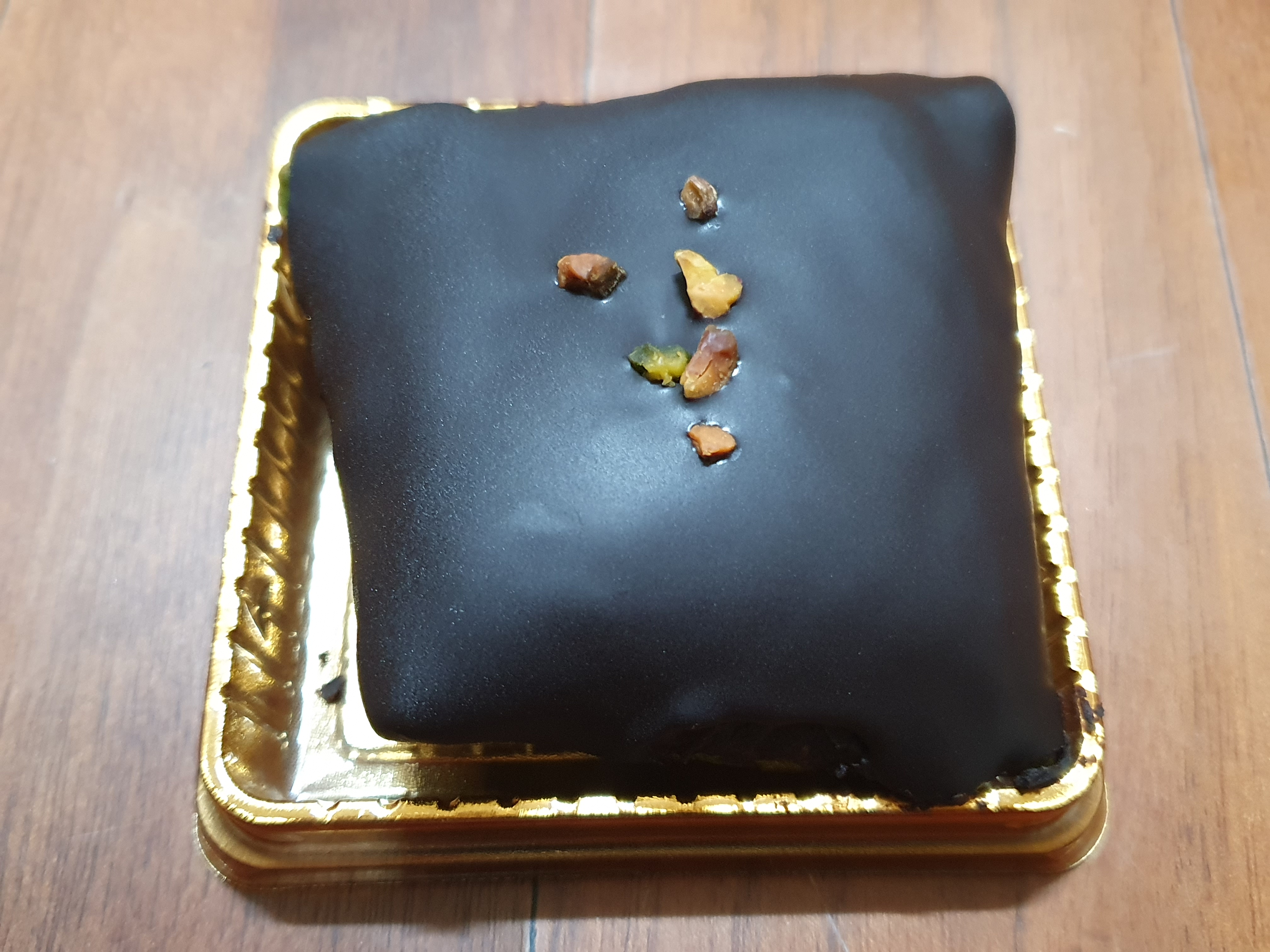 녹색 크레이프 안에 피스타치오 페이스트와 카다이프가 들어있고 윗면은 초콜릿 코팅을 하고 피스타치오 분태로 장식했다.