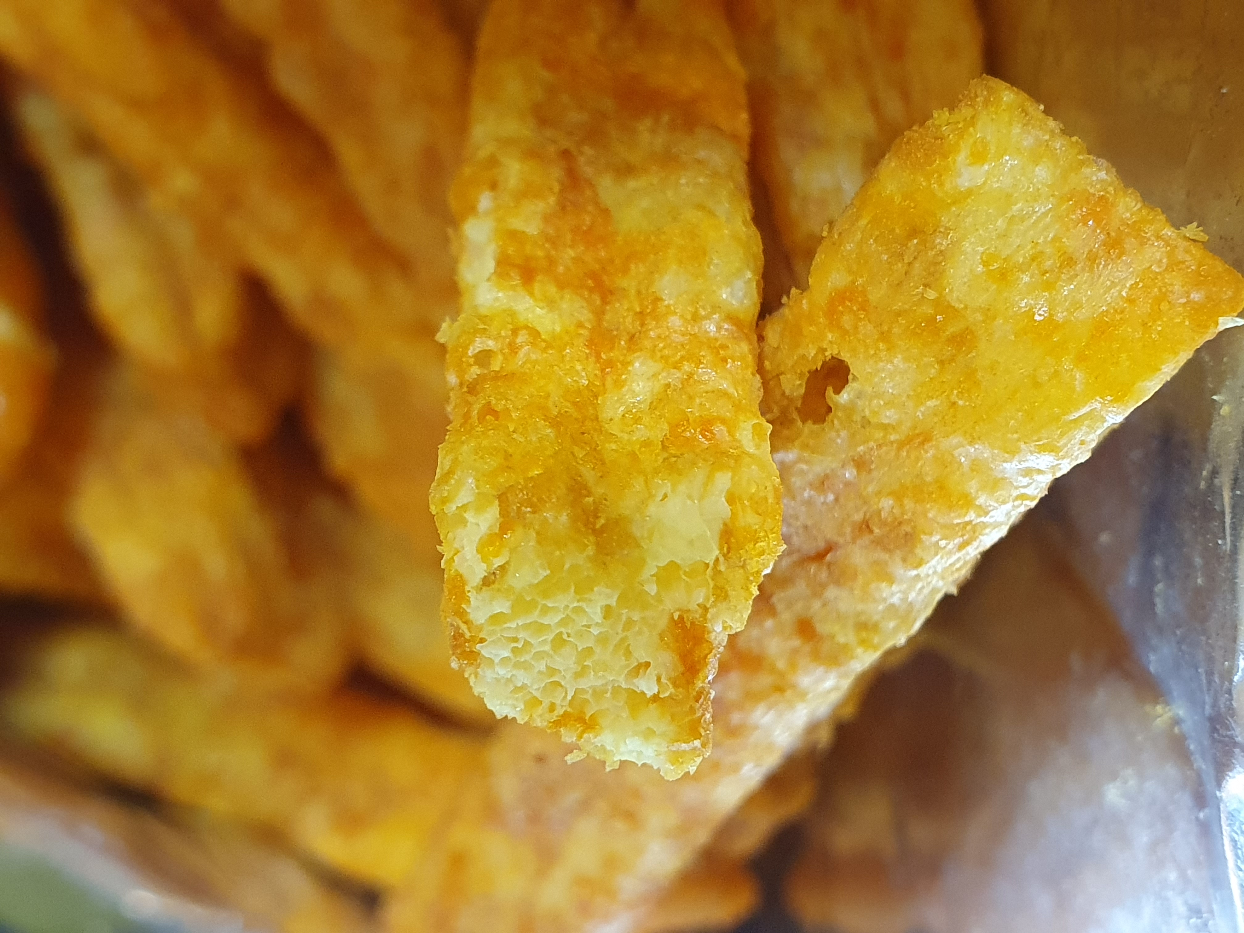 뜯어보니 진한 노란색 길쭉한 과자들이 보인다.
